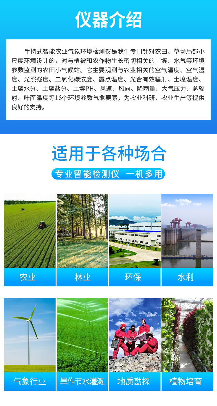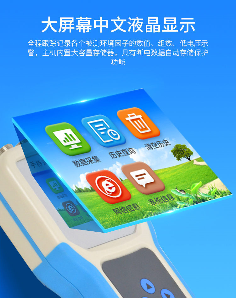 手持式智能農業(yè)氣象環(huán)境檢測儀是我們專門針對農田、草場局部小尺度環(huán)境設計的,對與植被和農作物生長密切相關的土壤、水氣等環(huán)境參數監(jiān)測的農田小氣候站。它主要觀測與農業(yè)相關的空氣溫度、空氣濕度、光照強度、二氧化碳濃度、露點溫度、光合有效輻射、土壤溫度、土壤濕度等8個環(huán)境參數氣象要素,為農業(yè)科研、農業(yè)生產等提供良好的支持。