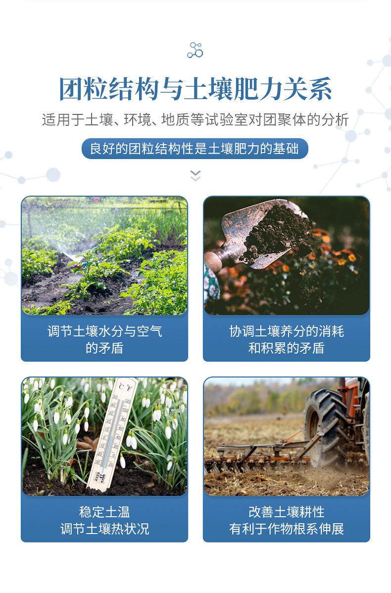 1、土壤團(tuán)粒結(jié)構(gòu)對(duì)土壤肥力起著重要作用。良好的團(tuán)粒結(jié)構(gòu)體一般應(yīng)具備三方面的性質(zhì):具有一定的大小,過大或過小都對(duì)形成適當(dāng)?shù)目紫侗壤焕?具有多級(jí)孔隙,大孔隙可通氣透水,小孔隙保水保肥;具有一定的穩(wěn)定性,即水穩(wěn)性、機(jī)械穩(wěn)性和生物學(xué)穩(wěn)定性。良好的團(tuán)粒結(jié)構(gòu)性是土壤肥力的基礎(chǔ),團(tuán)粒結(jié)構(gòu)與土壤肥力的關(guān)系主要表現(xiàn)在以下幾個(gè)方面:調(diào)節(jié)土壤水分與空氣的矛盾;協(xié)調(diào)土壤養(yǎng)分的消耗和積累的矛盾;穩(wěn)定土溫,調(diào)節(jié)土壤熱狀況;改善土壤耕性,有利于作物根系伸展。土壤團(tuán)粒分析儀適用于土壤、環(huán)境、地質(zhì)等試驗(yàn)室對(duì)團(tuán)聚體的分析。