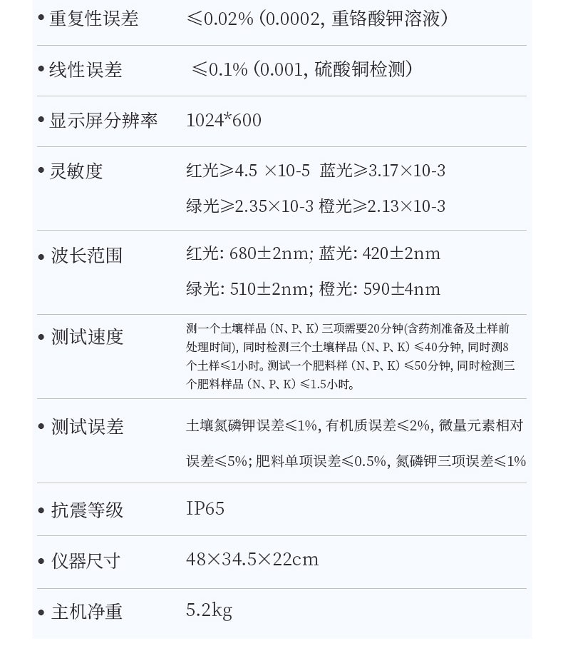 土壤氮磷鉀誤差≤1%,有機(jī)質(zhì)誤差≤2%,微量元素相對誤差≤5%;肥料單項(xiàng)誤差≤0.5%,氮磷鉀三項(xiàng)誤差≤1%。