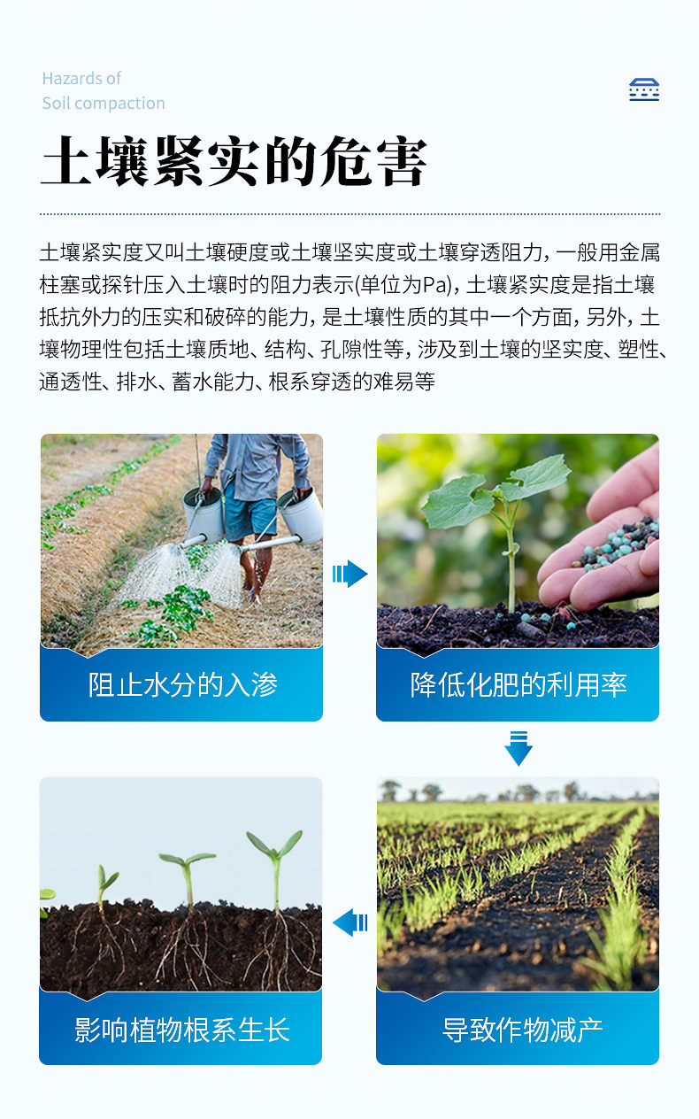 土壤緊實(shí)度由土壤抗剪力、壓縮力和摩擦力等構(gòu)成。是土壤強(qiáng)度的一個合成指標(biāo)。金屬柱塞或探針壓入土壤時分動載和靜載兩種方法,不同方法的測定值不同,但有聯(lián)系。柱塞的形狀有錐體、平頭、圓球及楔子等,這些對測定值也有影響。對同一種方法的測定值,主要決定于土壤質(zhì)地、容重和含水量。其中含水量的影響最大。土壤緊實(shí)度可預(yù)測土壤承載量、耕性和根系伸展的阻力。土壤緊實(shí)度的大小可影響作物根系的穿孔和生長,是一個重要的土壤物理特性指標(biāo),用于評價土壤耕性。緊實(shí)的土壤可阻止水分的入滲,降低化肥的利用率,影響植物根系生長,導(dǎo)致作物減產(chǎn)。