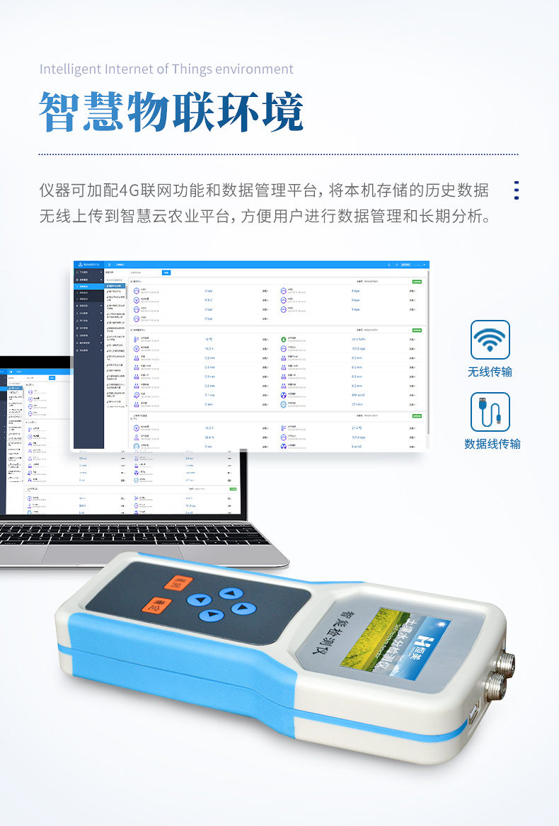 1、☆儀器可加配4G聯(lián)網(wǎng)功能和數(shù)據(jù)管理平臺(tái),將本機(jī)存儲(chǔ)的歷史數(shù)據(jù)無(wú)線(xiàn)上傳到智慧云農(nóng)業(yè)平臺(tái),方便用戶(hù)進(jìn)行數(shù)據(jù)管理和長(zhǎng)期分析。