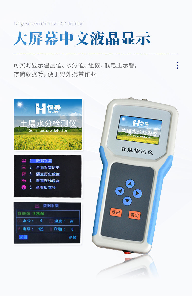 4、大屏幕中文液晶顯示,可實(shí)時(shí)顯示溫度值、水分值、組數(shù)、低電壓示警,存儲(chǔ)數(shù)據(jù)等,便于野外攜帶作業(yè)。